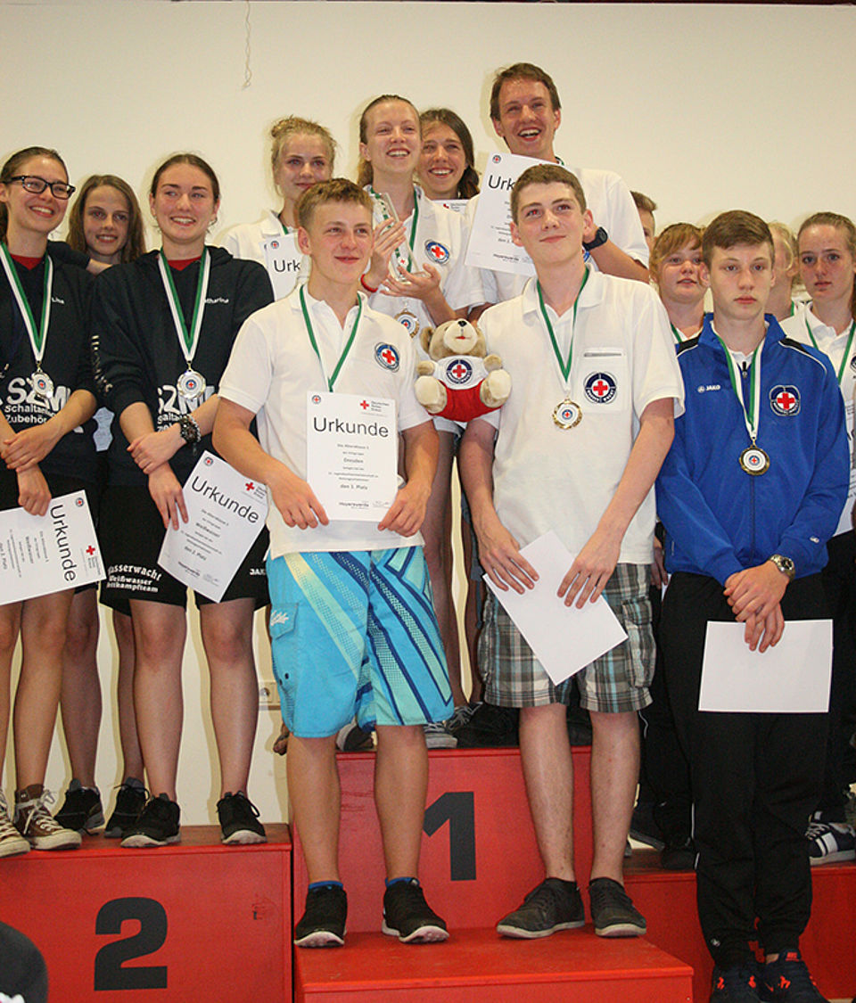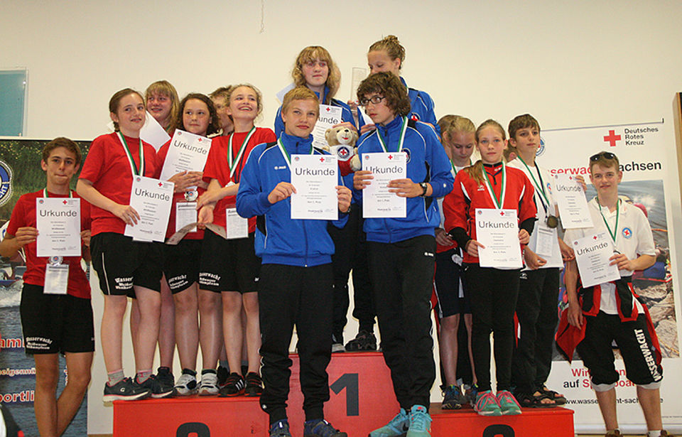 Platz 1: Dresden, Platz 2: Weißwasser, Platz 3: Freital Zu den Aufgaben im Schwimmteil gehörten z.B. bei den Kleinsten, die Balltransportstaffel und die Rettungsringstaffel. Die 11 bis 13-jährigen mussten sich u.a. bei einer Flossenstaffel ins Zeug legen. Für die großen Jugendlichen war es neben einer anspruchsvollen Staffel im Kleiderschwimmen über 50-Meter, u.a. auch eine Rettungsleinenstaffel, welche die jungen Schwimmer/-innen forderte.